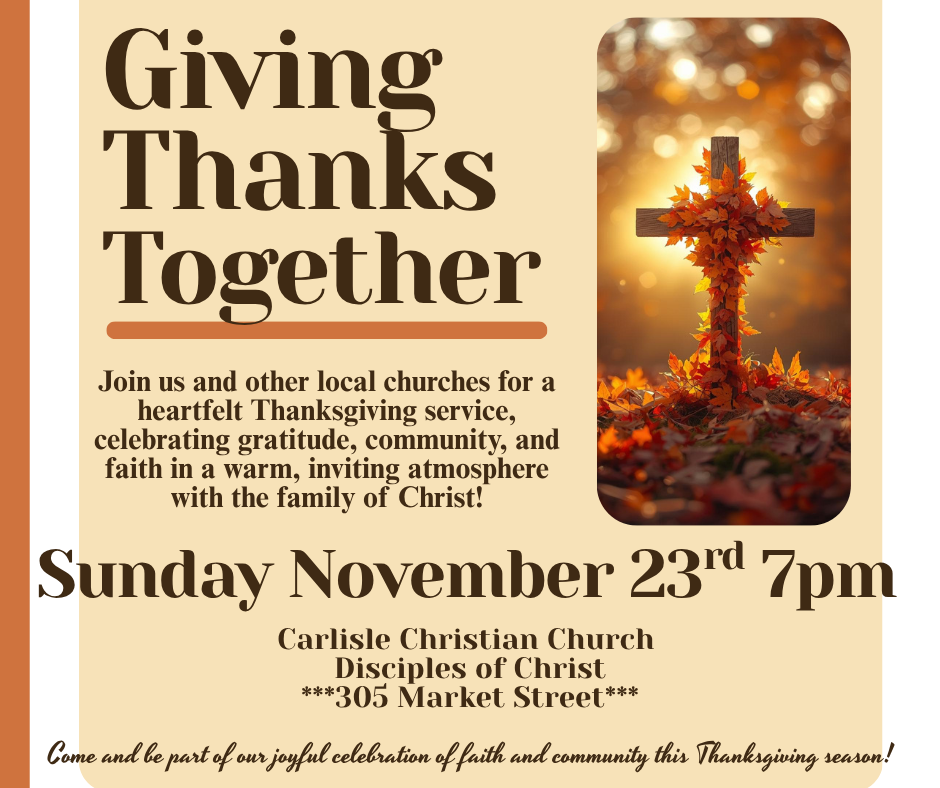 Join us and other local churches for a heartfelt Thanksgiving service celebrating gratitude, community, and faith in a warm, inviting atmosphere with the family of Christ. Sunday, November 23rd at 7pm.